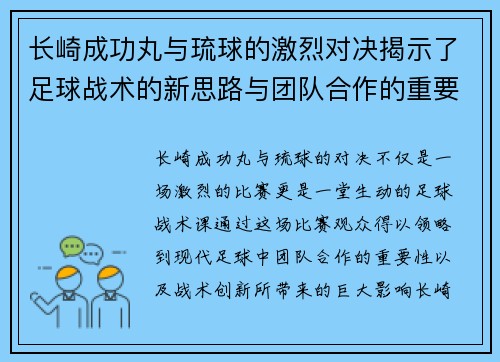 本文将重点分析吉林汉姆与克拉雷镇之间的精彩对决,揭示足球战术与团队合作在比赛中的重要性。通过探讨这场比赛中展现出的不同战术理念、球员间的默契配合、教练的战术布置以及团队精神的体现,我们可以更深入地理解足球不仅仅是一项运动,而是一门需要精妙策略和紧密协作的艺术。文章将从四个方面进行详细阐述,旨在让读者明白,在足球比赛中,成功依赖于每一位队员的努力与配合,以及教练在战术上的高瞻远瞩。 1、战术安排的...