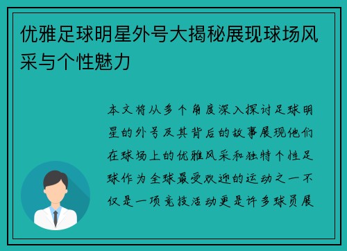 在现代足球运动中,球员的形象不仅仅体现在场上的技巧和表现,更在于他们所穿着的服装。尤其是中筒袜,作为足球装备的重要组成部分,不仅承担着保护小腿的功能,还展现出独特的时尚魅力。本文将从四个方面深入探讨足球明星中筒袜的时尚魅力与运动表现完美结合的秘密,包括设计理念、材料选择、品牌影响以及文化传播等方面。通过这些分析,我们能够更好地理解为什么中筒袜在足球界如此受欢迎,以及它们如何在运动性能与时尚元素之间...